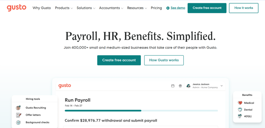 Gusto is a leading all-in-one payroll and HR platform designed to help small and growing businesses pay their teams, manage benefits, and stay compliant with ease. Whether you’re a startup, small business owner, or growing company, Gusto simplifies payroll, tax filings, employee onboarding, and benefits administration—all from one easy-to-use dashboard.